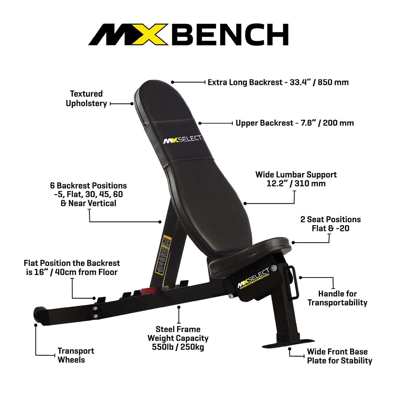 The MX Bench is the perfect compliment for MX Select Rapid Weight Change Dumbbells and Barbells. This fully adjustable bench (-5 to + 85 degrees) provides firm support for all your seated and prone exercises.